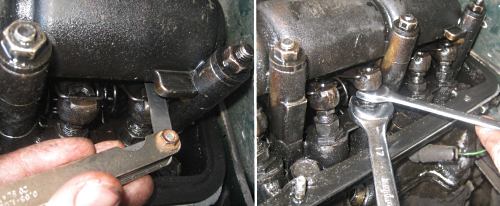 При правильно выставленных метках поршень 4-го цилиндра двигателя находится в ВМТ (верхней мертвой точке), а значит – самое время регулировать клапана №6 и №8. Отсчет номера клапана производится с передней части мотора, то есть слева от вас.Итак, возьмите щуп и вставьте его между распределительным валом и рокером. Осуществляться данная процедура должна с заметным затруднением. Если это не так: щуп заходит очень легко или, наоборот, вообще не вставляется – воздействуя на регулировочный болт и контрольную гайку, клапана необходимо регулировать. ➤ Рожковым ключом на 17 ослабьте зажим контргайки. ➤ Не отпуская последнюю, ключом на 13 произведите вращение верхней регулировочной гайки до получения оптимального зазора. ➤ Затяните контргайку в первоначальное положение. ➤ Проведите контрольный измерения щупом. ➤ При необходимости повторите все вышеописанные действия.м
