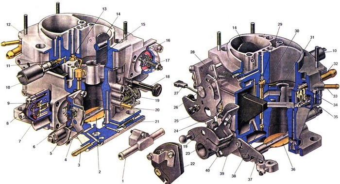1. Блок подогрева карбюратора 2. Дроссельная заслонка первой камеры 3. Патрубок для отсоса картерных газов 4. Рычаг привода ускорительного насоса 5. Кулачок привода ускорительного насоса 6. Диафрагма ускорительного насоса 7. Топливный жиклер экономайзера мощностных режимов 8. Корпус насоса 9. Диафрагма экономайзера мощностных режимов 10. Запорный электромагнитный клапан 11. Топливный жиклер холостого хода 12. Крышка карбюратора 13. Главный воздушный жиклер первой камеры 14. Воздушная заслонка 15. Распылители ускорительного насоса с клапаном подачи топлива 16. Диафрагма пускового устройства 17. Регулировочный винт пускового устройства 18. Регулировочный винт количества смеси холостого хода 19. Рычаг блокировки второй камеры 20. Патрубок для подачи разрежения к вакуумному регулятору распределителя зажигания 21. Регулировочный винт качества смеси холостого хода 22. Сектор управления дроссельными заслонками 23. Рычаг привода дроссельных заслонок 24. Регулировочный винт при открывания дроссельной заслонки первой камеры 25. Рычаг управления воздушной заслонкой 26. Шток пускового устройства 27. Электрический провод концевого выключателя экономайзера принудительного холостого хода 28. Рычаг воздушной заслонки 29. Главный воздушный жиклер второй камеры 30. Эмульсионная трубка 31. Распылитель главной дозирующей системы второй камеры 32. Патрубок подачи топлива 33. Патрубок слива топлива в бак 34. Топливный фильтр 35. Игольчатый клапан 36. Дроссельная заслонка второй камеры 37. Рычаг дроссельной заслонки второй камеры 38. Главный топливный жиклер второй камеры 39. Рычаг привода дроссельной заслонки второй камеры 40. Поплавок.