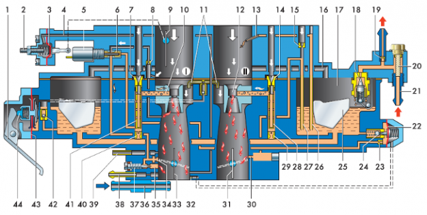 |. Первая камера карбюратора. ||. Вторая камера карбюратора. 1. Рычаг привода ускорительного насоса. 2. Регулировочный винт диафрагмы пускового устройства. 3. Диафрагма пускового устройства. 4. Воздушный канал пускового устройства. 5. Электромагнитный запорный клапан. 6. Топливный жиклер системы холостого хода. 7. Главный воздушный жиклер первой камеры. 8. Воздушный жиклер системы холостого хода. 9. Воздушная заслонка. 10. Распылитель главной дозирующей системы первой камеры. 11. Распылительные трубки ускорительного насоса. 12. Распылитель главной дозирующей системы второй камеры. 13. Распылитель эконостата. 14. Главный воздушный жиклер второй камеры. 15. Воздушный жиклер переходной системы второй кмеры. 16. Балансировочный канал поплавковой камеры. 17. Поплавковая камера. 18. Топливный игольчатый клапан. 19. Топливовозвратный штуцер. 20. Сетчатый фильтр. 21. Топливоподводящий штуцер. 22. Диафрагма экономайзера мощностных режимов. 23. Топливный жиклер экономайзера мощностных режимов. 24. Шариковый клапан экономайзера мощностных режимов. 25. Поплавок. 26. Топливный жиклер эконостата с трубкой. 27. Топливный жиклер переходной системы второй камеры. 28. Эмульсионная трубка второй камеры. 29. Главный топливный жиклер второй камеры. 30. Выходное отверстие переходной системы второй камеры. 31, 33. Дроссельные заслонки. 32. Демпфирующий жиклер. 34. Щель переходной системы первой камеры. 35. Выходное отверстие системы холостого хода. 36. Блок подогрева. 37. Регулировочный винт «качества» топливной смеси. 38. Штуцер системы вентиляции картера. 39. Штуцер отбора разрежения к вакуумному регулятору опережения зажигания. 40. Главный топливный жиклер первой камеры. 41. Эмульсионная трубка первой камеры. 42. Шариковый клапан ускорительного насоса. 43. Диафрагма ускорительного насоса. 44. Толкатель ускорительного насоса.