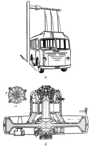 Гиробус — особый вид троллейбуса, движущийся за счёт кинетической энергии вращающегося маховика. В настоящее время гиробусы не используются, хотя концепт гиробуса является объектом научно-технических изысканий. Давайте попробуем разобраться в этой теме подробнее. Сначала вспомним, с чего все начиналось. По заказу швейцарской фирмы «Эрликон» Леонард Билл разработал в 1945 году проект маховичного автобуса, или, как его еще называли, гиробуса. Пять лет спустя был построен его опытный образец, а еще через три года в Цюрихе открылась первая транспортная линия, обслуживаемая новыми машинами. Гиробус был разработан как альтернатива для аккумуляторных автобусов, которые задумывались как альтернатива троллейбусам на тех маршрутах, где строительство контактной сети не было оправдано. Гиробус имел длину чуть более 10 м, массу 9600 кг и вмещал 70 человек. Под полом салона, между осями, располагался полуторатонный диск диаметром 1,63 м. Он был изготовлен из стали и помещен в контейнер с низким давлением для уменьшения трения. Но все равно каждые 800 м автобус вынужден был останавливаться для подзарядки. Три штанги, установленные на крыше, поднимались к контактам трехфазного источника тока напряжением 440—550 В. Напряжение подавалось к двухполюсному асинхронному электродвигателю, который и раскручивал маховик до рабочей скорости 2100—2900 об/мин. На зарядку уходило от 40 до 80 с. Гиробус трогался с места и благодаря хорошей приемистости за несколько секунд разгонялся до скорости 60 км/ч. Разгонный электродвигатель при этом автоматически переходил в режим генератора, от которого питался тяговый электромотор. «Маховоз» Билла имел 6 скоростей. КПД его был довольно высок — 70%. И все-таки, несмотря на явные преимущества (экологичность, дешевизна, бесшумность), в 1960 году эксплуатация гиробусов была прекращена. Причина — сложность управления и недовольство пассажиров частыми остановками. Гиробус или жиробус (образовано от греческого корня gyros — круг, оборот и новолатинизма omnibus — омнибус) — особый вид троллейбуса, движущийся за счёт кинетической энергии вращающегося маховика. В настоящее время гиробусы не используются, хотя концепт гиробуса является объектом научно-технических изысканий.Эксплуатация в Швейцарии. Полноценная коммерческая эксплуатация гиробуса началась в октябре 1953 года. Этот маршрут соединял швейцарские коммуны Ивердон-ле-Бан и Грандсон. Однако он имел ограниченный пассажиропоток, и в 1960 году движение гиробусов там было закрыто по экономическим причинам (хотя с технической точки зрения опыт применения гиробусов на этом маршруте был успешным). Ни один из использовавшихся на швейцарском маршруте гиробусов не сохранился, как не сохранился и опытный, демонстрационный экземпляр. Эксплуатация в Бельгийском Конго. Вторая гиробусная система была открыта в Леопольдвиле (ныне Киншаса, тогда столица колонии Бельгийское Конго, ныне — Демократическая Республика Конго). В Конго в 1955—1956 годах использовалось двенадцать гиробусов (хотя некоторые источники ошибочно сообщают, что гиробусов было семнадцать), которые обслуживали четыре маршрута. Заправочные станции располагались через каждые два километра. Использовавшиеся в Киншасе гиробусы были самыми большими гиробусами из когда-либо существовавших: они имели 10,4 метров в длину, весили 10,9 