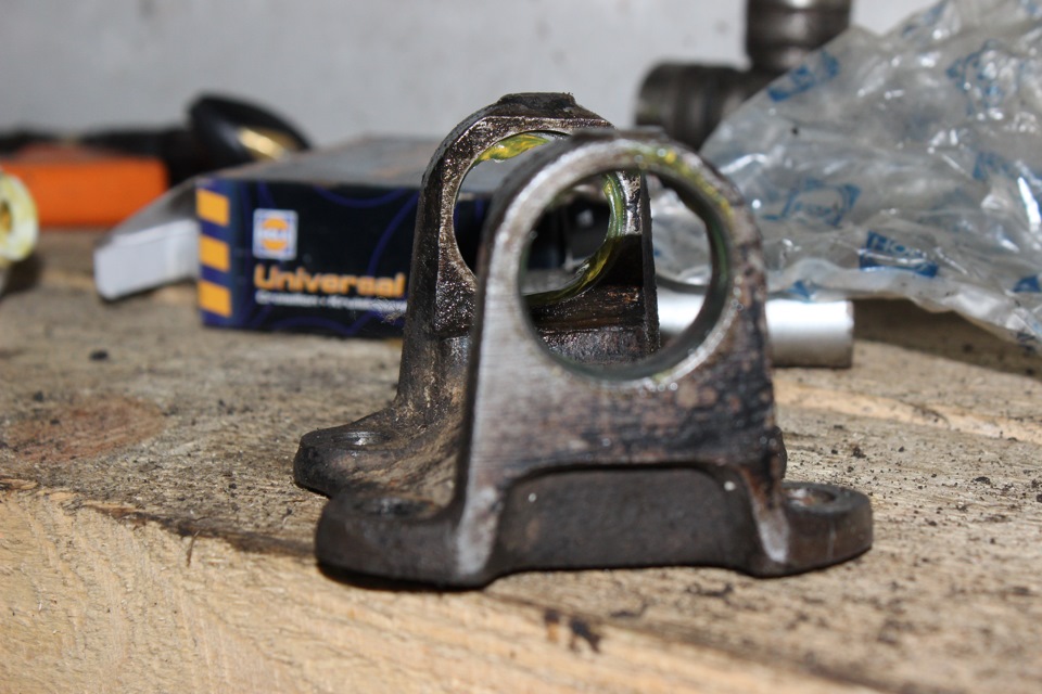 И ещё раз напомню — не забудьте снять стопорные кольца. Я один раз забыл — и получил сломанный съёмник. Выколачивается всё очень просто — молотим по одной чашке, вколачивая её внутрь вилки, противоположная чашка при этом вылезает наружу. Когда противоположная чашка вылезет наружу целиком — снимаем её с крестовины, после чего крестовину уже можно вынуть из вилки(сначала вынимаем тот конец, на котором ещё остался подшипник). Теперь кардан разомкнут, и вторую пару концов выколотить будет уже чуть-чуть проще. После того, как крестовина снята, осматриваем вилки на предмет наличия в них трещин. Помните — даже мельчайшая трещинка при повышении нагрузки может привести к поломке узла. Ну а дальше — устанавливаем новую крестовину. Здесь тоже есть свой порядок. 1. Чистим втулки вилок, в которые вставляются чашки крестовины 2. Смазываем втулки 3. Вколачиваем крестовину в одну вилку 4. Стопорим вколоченные чашки кольцами 5. Вколачиваем крестовину в другую вилку, не забыв посмотреть на отметки, сделанные перед снятием 6. Ставим вторую пару стопорных колец Чистим обычной WD-шкой и чистой тряпкой.