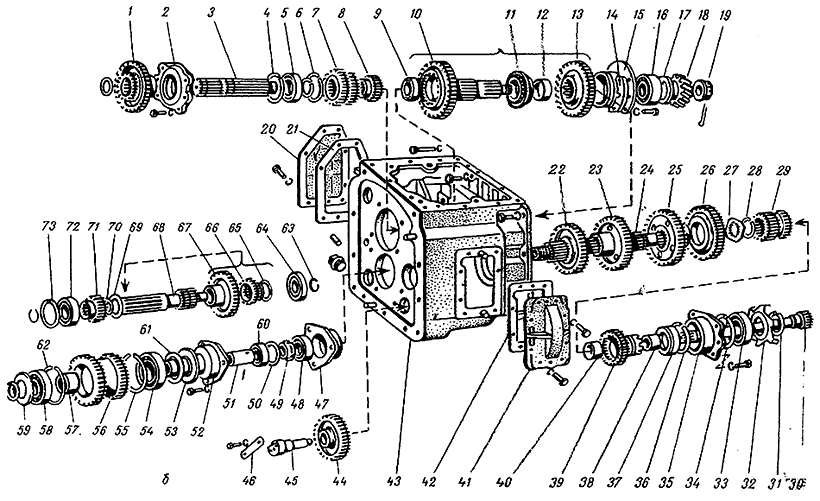 Схема коробки передач МТЗ 82: б — взаимное расположение деталей; 1 — ведомая шестерня понижающего редуктора; 2 — стакан первичного вала; 3 — первичный вал; 4, 6, 31, 34, 36, 50, 55, 62, 63, 65, 70, 73 — кольца; 5, 9, 11, 16. 33, 37, 48, 54, 58, 60, 64, 72 — подшипники; 7 — скользящая шестерня IV и V передач; 8 — скользящая шестерня III передачи; 10 — вторичный вал; 12 — распорная втулка; 13 — ведомая шестерня II ступени редуктора; 14 — регулировочная прокладка; 15 — стакан; 17, 27 — шайбы; 18 — шестерня; 19 — корончатая гайка; 20, 41 - крышки; 21, 42 — прокладки; 22 — ведомая шестерня V передачи и заднего хода; 23 — ведомая шестерня IV передачи; 24 — промежуточный вал; 25 — ведомая шестерня III передачи; 26 — промежуточная шестерня; 28 — упор; 29 — ведущая шестерня I ступени редуктора; 30 — внутренний вал; 32 — крыльчатка; 35 — стакан ведущей шестерни II ступени редуктора; 38, 52 — гнезда; 39 — ведущая шестерня II ступени редуктора со втулкой; 40, 51, 57— втулки; 43 — корпус коробки передач; 44 — промежуточная шестерня заднего хода; 45 — ось промежуточной шестерни заднего хода; 46 — планка; 47 — гнездо подшипника; 49 — гайка промежуточного вала; — заглушка; 56 — промежуточная шестерня понижающего редуктора; 59, 61 — маслоотражательные шайбы; 66 — ведомая шестерня включения ходоуменьшителя; 67 — ведомая шестерня I передачи и заднего хода со втулкой;. 68 — вал I передачи и заднего хода; 69 — свертная втулка; 71 — скользящая шестерня I передачи и заднего хода.