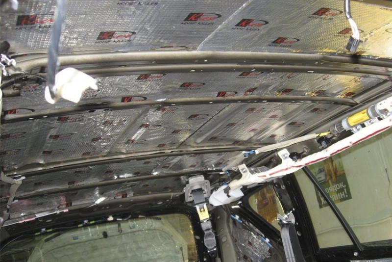 После дверей можно приступить к оклеиванию пола внедорожника УАЗ Патриот. Обязательно необходимо хорошо прогревать феном бесшумку и приклеивать. Не допускайте образования пузырей или воздуха под поверхностью, так как это повлечет за собой появление коррозии металла. Первым слоем следует наносить вибродемпфирующий слой (к примеру, Шумофф Микс), а после поверх него можно укладывать шумопоглощающий материал типа Шумофф Комфорт 10. Второй слой имеет толщину 3,5 мм, что собственно и влияет на эффективность обесшумливания транспортного средства.Шумоизоляция потолка