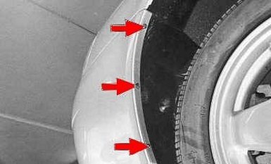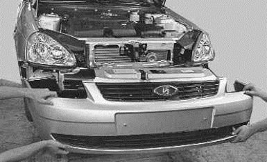 3. Со стороны колес открутить по 2 винта крепления бампера к подкрылкам; 4. Производим снятие бампера Приора выдвигая его вперед, освобождая его из зацепления с кузовом. Отсоедините провода от ПТФ.
