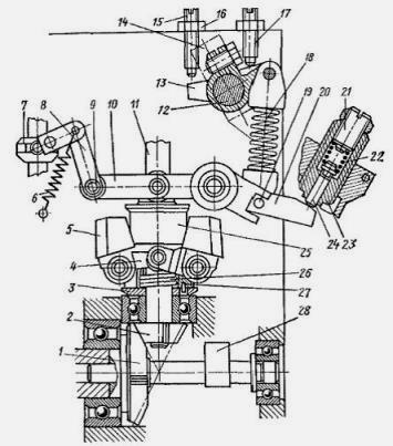 1 — ведущая шестерня; 2 — ведомая шестерня; 3 — шайба блокировки вала регулятора; 4 — стугрща регулятора; 5 — груз регулятора; 6 — пружина пуска; 7 — дозатор; 8 — тяга; 9 — эксцентриковый палец; 10 — основной рычаг регулятора; 11— вал регулятора; 12 —ось рычага управления; 13 — рычажная втулка; 14 — рычаг управления регулятором; 15 — ВИНТ «СТОП»; 16 — контргайка; 17 — винт максимальных оборотов; 18 — пружина регулятора; 19 — ось рычага корректора; 20 — рычаг корректора; 21 — регулировочный вннт корректора; 22 —пружина корректора; 23 — корпускорректора; 24 — шток корректора; 25 — муфта регулятора; 26 — демпферная пружина; 27 — штифт; 28 — вал привода подкачивающего насоса. Соединительная ось серьги пружины удерживает рычаг 20 корректора в проушинах основного рычага. Данное соединение выполнено с определенным зазором, допускающим независимое движение основного рычага под действием пружины 6 пуска в сторону дополнительного увеличения подачи топлива при пуске дизеля. Ступица 4 регулятора связана с валом 11 регулятора через демпферную пружину 26, шайбу 3 блокировки и штифт 27. Такое соединение обеспечивает снятие динамических нагрузок и колебаний, передающихся от привода насоса, и исключает возможность разноса дизеля при поломке пружины. На верхнем торце вала 11 регулятора нанесена риска, а в крышке имеется лимб 14, необходимый для установки или проверки правильности распределения. При работе дизеля Д-144 трактора Т40 всякое изменение нагрузки приводит к изменению частоты вращения коленчатого вала. Грузы, преодолевая натяжение пружины регулятора, расходятся под действием центробежных сил с увеличением частоты вращения или же сходятся при ее снижении. Отклонение грузов вызывает перемещение муфты 25 и основного рычага 10, которое передается через систему рычагов к дозатору. Подача топлива при этом уменьшается или увеличивается, в результате чего обеспечивается заданная частота вращения коленчатого вала дизеля.