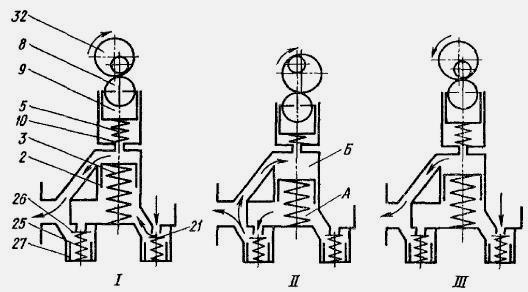 1- корпус; 2 — поршень; 3 — пружина поршня; 4 — втулка штока; 5 -шток поршня; 6 — стопорное кольцо; 7 — ось; 8 — ролик; 9 — толкатель поршня; 10 -— пружина; 11 — рукоятка насоса ручной прокачки; 12 — крышка насоса цилиндра; 13 — шток; 14 — цилиндр; 15 — штифт; 16 — поршень ручнойпрокачки; 17, 18, 24 — уплотнительные кольца; 19, 22, 29 прокладки; 20 — болт; 21 — впускной клапан; 23 — пробка пружины; 25 - пружинаклапана; 26 — выпускной клапан; 27 — пробка клапана; 28 - клапана; 30 — заглушка; 31 — болт поворотного угольника. Подкачивающий насос трактора Т-40 поршневого типа установлен в боковой расточке корпуса насоса. В действие топливный насос приводится от эксцентрикового вала 80, связанного с кулачковым валом 81. Подкачивающий насос состоит из корпуса 1, рабочего поршня 2, пружины 3 поршня, прецизионной втулки 4 со штоком 5, впускного 21 и выпускного 26 клапанов, пробки 27 клапана, насоса ручной прокачки в сборе, толкателя 9 поршня, ролика 5, оси 7, пробки 23 пружины, уплотни-тельного кольца 24, прокладок, болтов поворотных угольников подвода и отвода топлива. Подкачивающий насос Д-144 трактора Т-40 работает следующим образом. При вращении вала поршень совершает возвратно-поступательное движение под действием эксцентрика 32 (рис. 14, положение I) и пружины 3. При перемещении поршня 2 под действием пружины 3 в сторонуэксцентрика в полости А насоса создается разрежение. Под действием разрежения топливо, преодолевая усилие пружины, открывает впускной клапан 21 и поступает в полость А, При набегании эксцентрика 32 на ролик 8 через толкатель 9 и шток 5 поршень 2, преодолевая усилие пружины 3, перемещается в обратном направлении, уменьшая при этом объем полости А. Под действием повышающегося давления топлива в полости А насоса и усилия пружины 25 впускной клапан 21 закрывается, открывается выпускной клапан 26, и топливо поступает в полость Б и линию нагнетания топливного насоса (см. рис, положение II). Из полости Б при ходе впуска топливо вытесняется поршнем в нагнетательную полость подкачивающего насоса.При достижении определенного давления в нагнетательной полости поршень 2 не доходит до своего крайнего положения при ходе впуска.