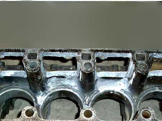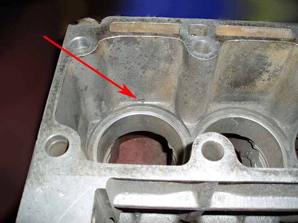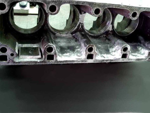 Для этого в нижней части внутреннего простенка бокового канала, напротив каждой гильзы, просверливается по 2 отверстия. А в верхней части простенка вырезаются фрагменты и привариваются (используя технологию сварки в среде аргона) к боковой стенке, под наклоном, таким образом, чтобы перекрыть сообщение канала с рубашкой головки.