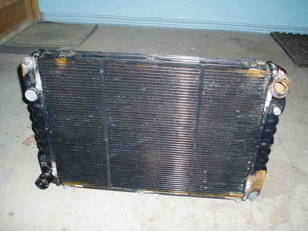 Трехрядный радиатор автомобиля ГАЗ 2705, доработанный для установки в Москвич 2141Для того чтобы не терять скорости циркуляции ОЖ, не сложно изменить схему ее движения в радиаторе М2141. В стандартном радиаторе М2141 правый бачок разбит на 2 секции. ОЖ движется по теплорассеивающим трубкам последовательно через верхнюю и нижнюю части радиатора. Такая схема вдвое уменьшает проходное сечение радиатора, не увеличивая его мощности рассеяния. Удалив внутреннюю перегородку в правом бачке и перенеся входной патрубок в левый бачок можно существенно снизить сопротивление, оказываемое течению ОЖ радиатором.После сварочных работ для снятия внутренних напряжений блок двигателя проходит процесс пристаривания в печи при 200°С в течение суток, после чего необходимо заверить все плоскости на координатно-расточном станке, а также обработать притиром постели коренных подшипников.