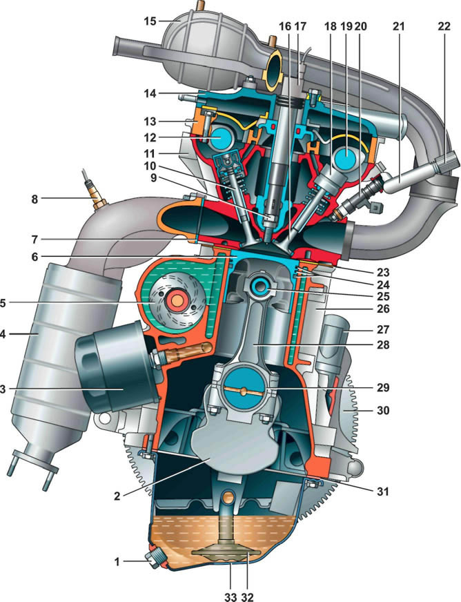 Поперечный разрез двигателя 11194: 1 — пробка сливного отверстия поддона картера; 2 — коленчатый вал; 3 — масляный фильтр; 4 — каталитический коллектор; 5 — насос охлаждающей жидкости; 6 — поршень; 7 — прокладка каталитического коллектора; 8 — датчик концентрации кислорода; 9 — свеча зажигания; 10 — клапан выпускной; 11 — головка блока цилиндров; 12 — распределительный вал выпускных клапанов; 13 — корпус подшипников распределительных валов; 14 — крышка головки блока цилиндров; 15 — впускной модуль; 16 — впускной клапан; 17 — катушка зажигания; 18 — гидротолкатель; 19 — распределительный вал впускных клапанов; 20 — форсунка; 22 — диагностический штуцер топливной рампы; 21 — топливная рампа; 23 — прокладка головки блока цилиндров; 24 — поршневые кольца; 25 поршневой палец; 26 — блок цилиндров; 27 штуцер системы вентиляции картера; 28 — шатун; 29 — шатунные вкладыши; 30 — маховик; 31 — прокладка поддона картера; 32 — маслозаборник; 33 — поддон картера двигателя.