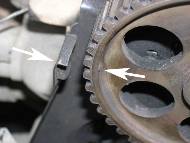 4. Сверяем метки на шестерне распредвала и выступе на задней крышке кожуха ремня.