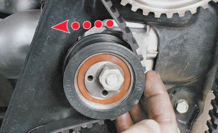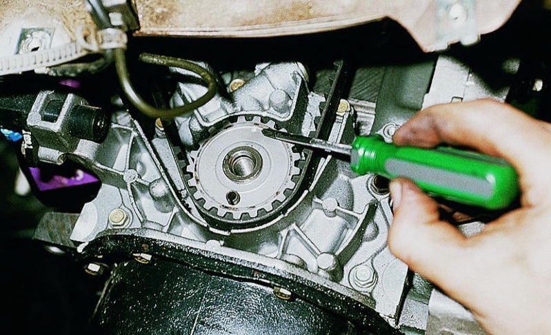 13. Прикручиваем шкив генератора, надев на него ремень. Натягиваем его. 14. Старый натяжной ролик демонтируем, ставим новый, смазав его с обеих сторон маслом. 15. Проводим натяжение ремня ГРМ, проворачивая ролик натяжителя вправо (если нет специального ключа, можно вставить в отверстия два подходящих штыря и зафиксировать отверткой или другим похожим предметом). Натяжение должно составлять 1,5-2 кгс. Если у вас нет инструмента для того чтобы замерить величину натяжения, делаем это старым проверенным способом. Оптимальным считается натяжение, когда одну плоскость ремня можно развернуть горизонтально на 90 градусов, взявшись пальцами посредине между шестернями коленвала и распредвала.