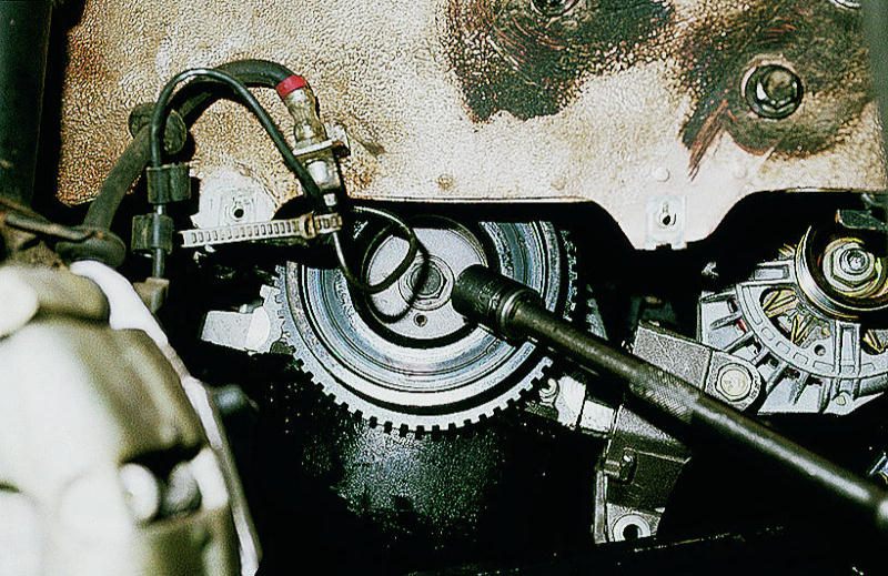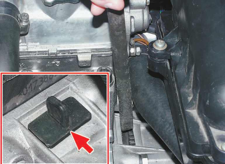 5. Если они не совпадают, нужно провернуть коленвал до совпадения. Это можно сделать путем вращения переднего колеса, предварительно поддомкратить его, или же провернуть коленвал ключом на 17, за болт крепления шкива коленчатого вала (передача должна быть включена). 6. За 4-м цилиндром на картере сцепления есть резиновая заглушка. Открываем ее, поддев отверткой. Под ней видно венец маховика, на котором также есть метка. Она должна совпадать с треугольным пропилом, находящимся на картере слева от маховика. 7. Если они не совпадают, нужно отпустить крепление натяжного ролика, повернуть его влево, ослабив таким образом ремень, и снять его с шестерни распределительного вала.