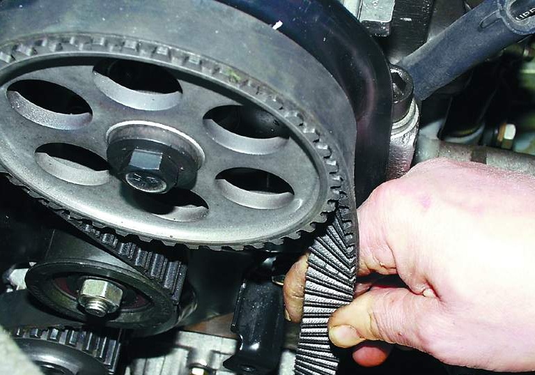 11. За ним находится шкив коленвала, на который надевается ремень, подлежащий замене. 12. Снимаем старый и надеваем новый ремень ГРМ, начиная с шестерни коленчатого вала.
