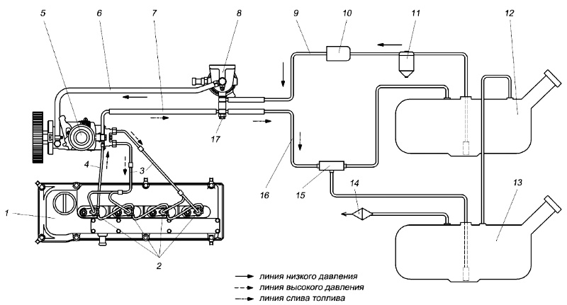 Топливо из правого топливного бака 12 через фильтр грубой очистки топлива 11 подается топливным электронасосом 10 под давлением к фильтру тонкой очистки топлива 8 (ФТОТ). При давлении подаваемого электронасосом топлива больше 60-80 КПа (0,6-0,8 кгс/см2) перепускной клапан 17 открывается, отводя избыточное топливо в линию слива 16. Очищенное топливо от ФТОТ поступает в топливный насос высокого давления (ТНВД) 5. Далее топливо подается с помощью плунжера-распределителя ТНВД в соответствии с порядком работы цилиндров по топливопроводам высокого давления 3 к форсункам 2, с помощью которых осуществляется впрыскивание топлива в камеру сгорания дизеля. Избыточное топливо, а также попавший в систему воздух отводятся от форсунок, ТНВД и перепускного клапана по топливопроводам слива топлива в баки.