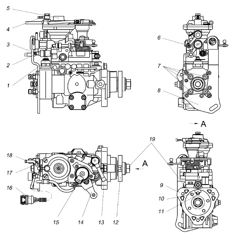 Топливный насос высокого давления BOSCH типа VE: 1 – электромагнитный клапан остановки двигателя; 2 - винт регулировки максимальных оборотов холостого хода; 3 – регулировочный винт максимальной подачи топлива (опломбирован и при эксплуатации не регулируется); 4 – штуцер корректора по наддуву воздуха; 5 – корректор по наддуву воздуха; 6 – винт регулировки минимальных оборотов холостого хода; 7 – штуцера топливопроводов высокого давления; 8 – кронштейн крепления ТНВД; 9 – фланец крепления ТНВД; 10 – отверстие корпуса ТНВД для установки штифта-центратора; 11 – паз ступицы под штифт-центратор ТНВД; 12 – ступица шкива ТНВД; 13 – штуцер подвода топлива; 14 – рычаг подачи топлива; 15 – датчик положения рычага подачи топлива; 16 – разъем датчика; 17 – штуцер подвода отсечного топлива от форсунок; 18 – штуцер отвода топлива в линию слива; 19 – гайка крепления ступицы на валу ТНВД