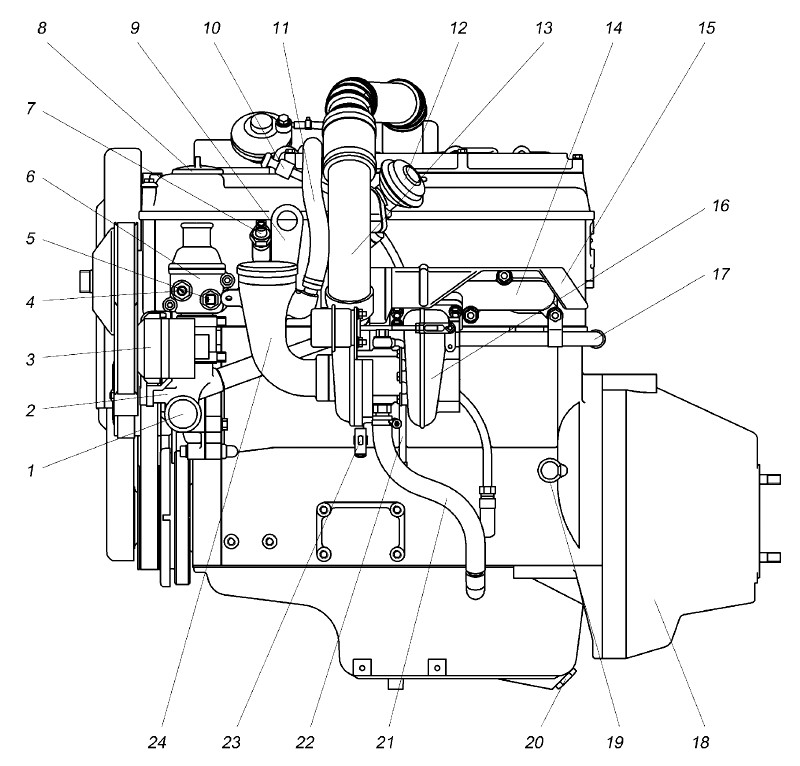 Левая сторона двигателя: 1 – патрубок водяного насоса подвода ОЖ от радиатора; 2 – водяной насос; 3 – насос гидроусилителя рулевого управления (ГУР); 4 – датчик температуры охлаждающей жидкости (системы управления); 5 – датчик указателя температуры ОЖ; 6 – корпус термостата; 7 – датчик сигнализатора аварийного давления масла; 8 – крышка маслозаливной горловины; 9 – передний кронштейн подъема двигателя; 10 – рукоятка указателя уровня масла; 11 – шланг вентиляции; 12 – клапан рециркуляции; 13 – выпускной патрубок турбокомпрессора; 14 – выпускной коллектор; 15 – теплоизоляционный экран; 16 – турбокомпрессор; 17 – трубка отопителя; 18 – картер сцепления; 19 – заглушка отверстия под установочный штифт коленчатого вала; 20 – пробка сливного отверстия масляного картера; 21 – шланг слива масла из турбокомпрессора; 22 – трубка нагнетательная масла к турбокомпрессору; 23 – краник слива ОЖ; 24 – впускной патрубок турбокомпрессора.