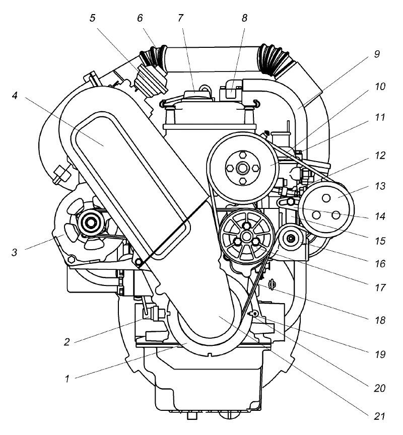 Вид спереди: 1 – шкив-демпфер коленчатого вала; 2 – датчик положения коленчатого вала; 3 – генератор; 4 – верхний кожух ремня привода ТНВД; 5 –ТНВД; 6 – воздуховод; 7 – крышка маслозаливной горловины; 8 – маслоотделитель; 9 – шланг вентиляции; 10 – ремень привода вентилятора и насоса ГУР; 11 – шкив вентилятора; 12 – натяжной болт насоса ГУР; 13 – шкив насоса ГУР; 14 – натяжной кронштейн ремня привода вентилятора и насоса ГУР; 15 – кронштейн насоса ГУР; 16 – направляющий ролик; 17 – шкив водяного насоса; 18 – ремень привода генератора и водяного насоса; 19 – указатель верхней мертвой точки (ВМТ); 20 – метка ВМТ на роторе датчика; 21 – нижний кожух ремня привода ТНВД.