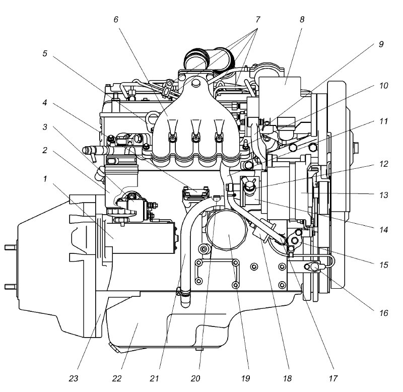 Правая сторона двигателя: 1 – стартер; 2 – фильтр тонкой очистки топлива (ФТОТ) (транспортное положение); 3 – тяговое реле стартера; 4 – крышка привода масляного насоса; 5 – задний кронштейн подъема двигателя; 6 – ресивер; 7 – топливопроводы высокого давления; 8 – топливный насос высокого давления (ТНВД); 9 – задняя опора ТНВД; 10 – точка крепления «–» провода КМСУД; 11 - шланг подвода ОЖ к жидкостно-масляному теплообменнику; 12 – штуцер вакуумного насоса; 13 – генератор; 14 – вакуумный насос; 15 – крышка нижнего гидронатяжителя; 16 – датчик положения коленчатого вала; 17 – шланг подвода масла к вакуумному насосу; 18 – датчик указателя давления масла; 19 – масляный фильтр; 20 – патрубок жидкостно-масляного теплообменника отвода ОЖ; 21 – шланг слива масла из вакуумного насоса; 22 – масляный картер; 23 – усилитель картера сцепления.