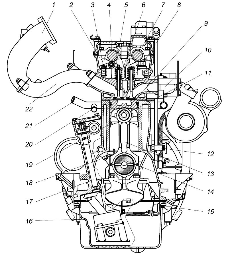 Поперечный разрез двигателя: 1 – ресивер; 2 – головка цилиндров; 3 – гидроопора; 4 – распределительный вал впускных клапа- нов; 5 – рычаг привода клапана; 6 – впускной клапан; 7 – распределительный вал выпускных кла- панов; 8 – выпускной клапан; 9 – поршень; 10 – выпускной коллектор; 11 – поршневой палец; 12 – сливной краник ОЖ; 13 – шатун; 14 – коленчатый вал; 15 – указатель уровня масла; 16 – мас- ляный насос; 17 – валик привода масляного и вакуумного насосов; 18 – форсунка охлаждения поршня; 19 – блок цилиндров; 20 – перепускной патрубок трубки отопителя; 21 – отводящий пат- рубок трубки отопителя; 22 – впускная труба.