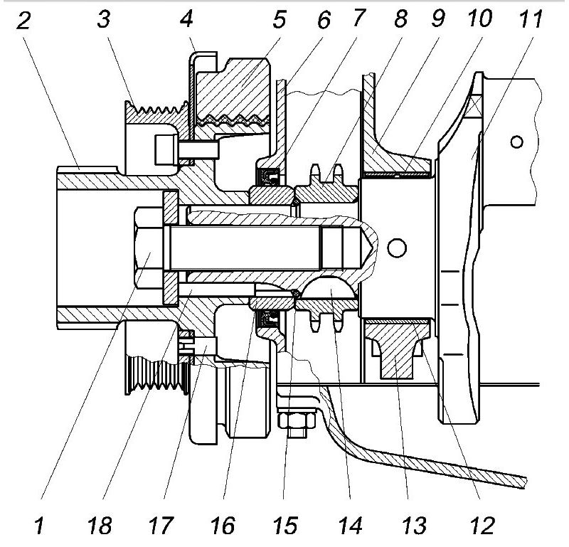 Передний конец коленчатого вала: 1 – стяжной болт; 2 – зубчатый шкив коленчатого вала; 3 – поликлиновой шкив коленчатого вала; 4 – ротор датчика; 5 – диск демпфера; 6 – крышка цепи; 7 – манжета; 8 – звездочка; 9 – блок цилиндров; 10 – верхний коренной вкладыш; 11 – коленчатый вал; 12 – нижний коренной вкладыш; 13 – крышка коренного подшипника; 14 – шпонка сегментная; 15 – кольцо резиновое уплотнительное; 16 – втулка; 17 – установочный штифт ротора датчика; 18 – шпонка призматическая.