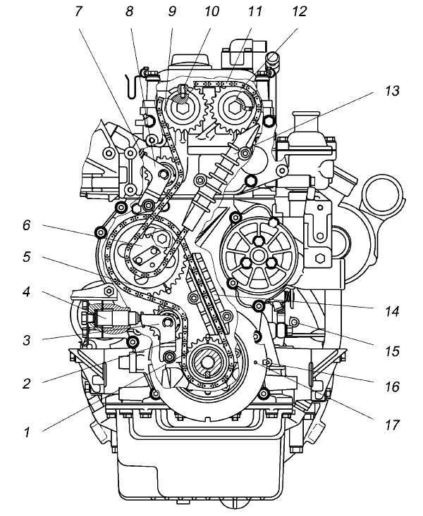 Привод распределительных валов: 1 – звездочка коленчатого вала; 2 – нижняя цепь; 3,8 – рычаг натяжного устройства со звездочкой; 4,7 – гидронатяжитель; 5 – ведомая звездочка промежуточного вала; 6 – ведущая звездочка промежуточного вала; 9 – звездочка впускного распределительного вала; 10 – технологическое отверстие под установочный штифт; 11 – верхняя цепь; 12 – звездочка выпускного распределительного вала; 13 – успокоитель цепи средний; 14 – успокоитель цепи нижний; 15 – отверстие под установочный штифт коленчатого вала; 16 – указатель ВМТ (штифт) на крышке цепи; 17 – метка на роторе датчика положения коленчатого вала