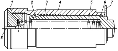 Гидроопора: 1 – корпус; 2 – пружина; 3 – обратный клапан; 4 – поршень; 5 – отверстие для подвода масла; 6 –стопорное кольцо; 7 – плунжер; 8 – полость между корпусом и поршнем
