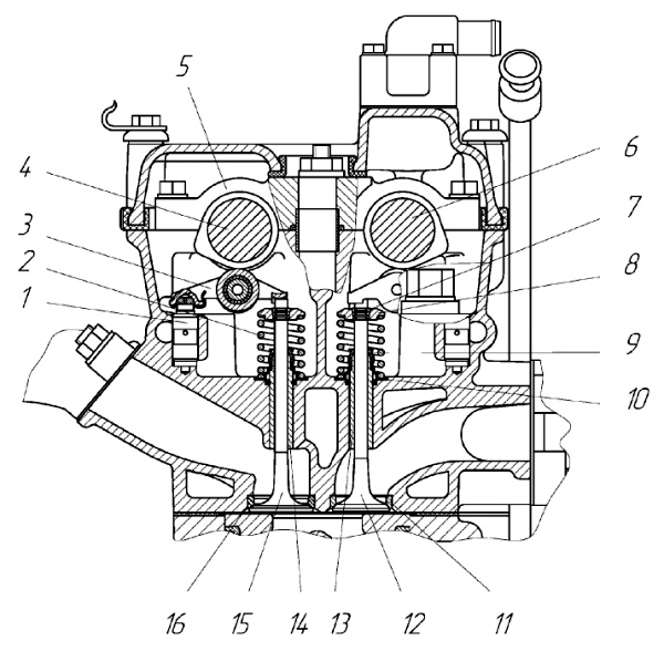 Привод клапанов: 1 – гидроопора; 2 – пружина клапана; 3 – рычаг привода клапана; 4 – распределительный вал впускных клапанов; 5 – крышка распределительных валов; 6 – распределительный вал выпускных клапанов; 7 – сухарь клапана; 8 – тарелка пружины клапана; 9 – маслоотражательный колпачок; 10 – опорная шайба пружины клапана; 11 – седло выпускного клапана; 12 – выпускной клапан; 13 – направляющая втулка выпускного клапана; 14 – направляющая втулка впускного клапана; 15 – впускной клапан; 16 – седло впускного клапана.