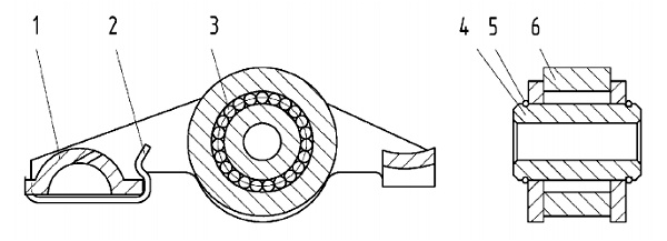 Рычаг привода клапана: 1 – рычаг привода клапана; 2 – скоба рычага привода клапана; 3 – подшипник игольчатый; 4 – ось ролика рычага клапана; 5 – стопорное кольцо; 6 – ролик рычага клапана.