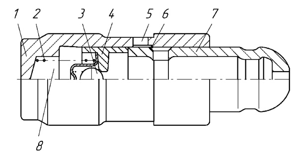 1 – корпус клапана в сборе; 2 – запорное кольцо; 3 – плунжер; 4 – корпус; 5 – пружина; 6 – стопорное кольцо; 7 – транспортный стопор; 8 – отверстие для подвода масла из системы смазки