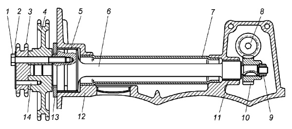 Промежуточный вал: 1 – болт; 2 – стопорная пластина; 3 – ведущая звездочка; 4 – ведомая звездочка; 5 – передняя втулка вала; 6 – промежуточный вал; 7 – труба промежуточного вала; 8 – валик-шестерня; 9 – гайка; 10 – шестерня привода масляного насоса; 11 – задняя втулка вала; 12 – блок цилиндров; 13 – фланец промежуточного вала; 14 – штифт.