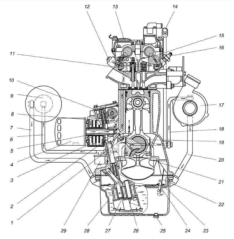Схема системы смазки: 1 – форсунка охлаждения поршня; 2 – главная масляная магистраль; 3 – теплообменник жидкостно-масляный; 4 – масляный фильтр; 5 – калиброванное отверстие подачи масла на шестерни привода масляного насоса; 6 – шланг подвода масла к вакуумному насосу; 7 – шланг слива масла из вакуумного насоса; 8 – подвод масла к верхнему подшипнику валика привода масляного насоса; 9 – вакуумный насос; 10 – подача масла к втулкам промежуточного вала; 11 – подвод масла к гидроопоре; 12 – верхний гидронатяжитель цепи; 13 – крышка маслозаливной горловины; 14 – рукоятка указателя уровня масла; 15 – подвод масла к опорной шейке распределительного вала; 16 – датчик сигнализатора аварийного давления масла; 17 – турбокомпрессор; 18 – нагнетательная трубка масла в турбокомпрессор; 19 – шатунный подшипник; 20 – шланг слива масла из турбокомпрессора; 21 – коренной подшипник; 22 – указатель уровня масла; 23 – метка «П» верхнего уровня масла; 24 – метка «0» нижнего уровня масла; 25 – пробка слива масла; 26 – маслоприемник с сеткой; 27 – масляный насос; 28 – масляный картер; 29 – датчик указателя давления масла.