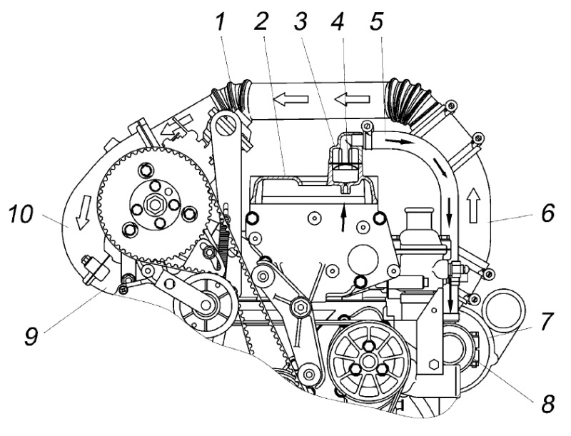 При работе двигателя картерные газы проходят по каналам блока цилиндров в головку цилиндров, смешиваясь по пути следования с масляным туманом, далее проходят через маслоотделитель, который встроен в крышку клапанов 2. В маслоотделителе масляная фракция картерных газов отделяется маслоотражателем 4 и стекает через отверстия в полость головки цилиндров и далее в картер двигателя. Осушенные картерные газы по шлангу вентиляции 5 поступают через впускной патрубок 8 в турбокомпрессор 7, в котором они смешиваются с чистым воздухом и подаются через выпускной (нагнетательный) патрубок 6 турбокомпрессора по воздуховоду 1 последовательно в ресивер 10, впускную трубу 9 и далее в цилиндры двигателя.