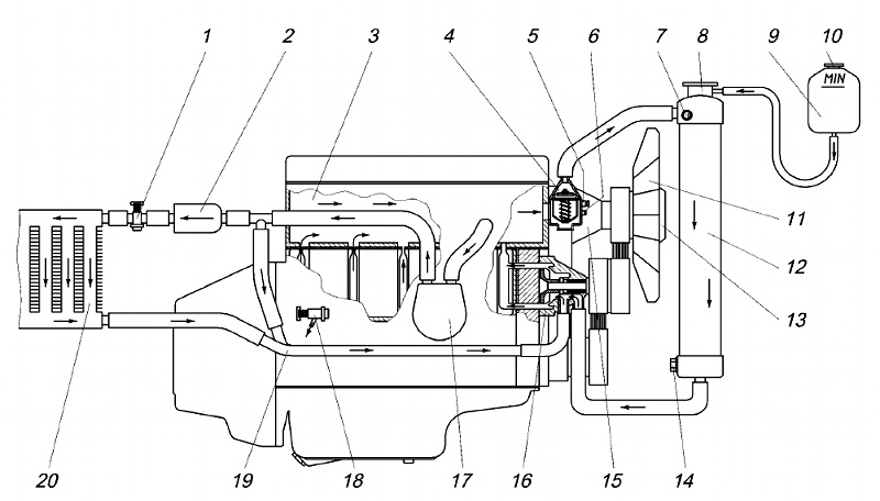 Схема системы охлаждения двигателя на автомобилях УАЗ: 1 – краник отопителя салона; 2 – электронасос отопителя; 3 – двигатель; 4 – термостат; 5 – датчик указателя температуры ОЖ; 6 – датчик температуры охлаждающей жидкости (системы управления); 7 – датчик сигнализатора перегрева ОЖ; 8 – заливная горловина радиатора; 9 – расширительный бачок; 10 – пробка расширительного бачка; 11 – вентилятор; 12 – радиатор системы охлаждения; 13 – муфта вентилятора; 14 – сливная пробка радиатора; 15 – привод вентилятора; 16 – водяной насос; 17 – теплообменник жидкостно-масляный; 18 – сливной краник ОЖ блока цилиндров; 19 – трубка отопителя; 20 – радиатор отопителя салона.