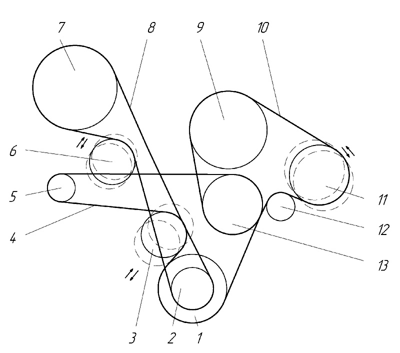 Схема привода вспомогательных агрегатов: 1 – шкив коленчатого вала привода водяного насоса и генератора; 2 – зубчатый шкив привода ТНВД; 3 – натяжной ролик; 4 – ремень привода генератора и водяного насоса; 5 – шкив генератора; 6 – натяжной ролик ремня привода ТНВД; 7 – шкив ТНВД; 8 – зубчатый ремень привода ТНВД; 9 – шкив вентилятора; 10 – ремень привода вентилятора и насоса ГУР; 11 – шкив насоса ГУР; 12 – направляющий ролик; 13 – шкив водяного насоса.