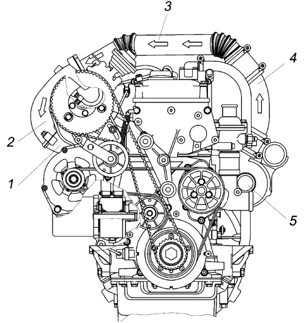 Система впуска воздуха: 1 – впускная труба; 2 – ресивер; 3 – воздуховод; 4 – выпускной патрубок турбокомпрессора; 5 – турбокомпрессор.