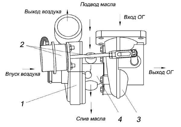 Турбокомпрессор: 1 – корпус компрессора; 2 – пневмопривод перепускного клапана; 3 – корпус турбины; 4 – корпус подшипников.