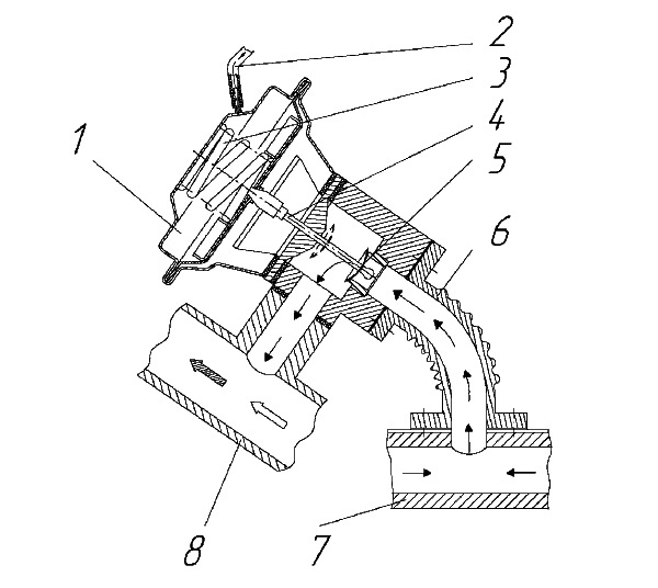 Система рециркуляции отработавших газов: 1 – пневмокамера; 2 – шланг от электромагнитного клапана управления к клапану рециркуляции; 3 – пружина; 4 – шток клапана рециркуляции; 5 – клапан рециркуляции; 6 – трубка рециркуляции; 7 – коллектор; 8 – выпускной патрубок турбокомпрессора.